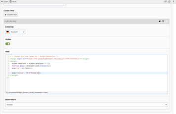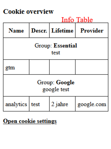 Füge Cookies in den gewünschten Gruppen hinzu, zusammen mit dessen Beschreibung(wenn die Infotable genutzt werden soll) und entsprechendem HTML/ Script Tags