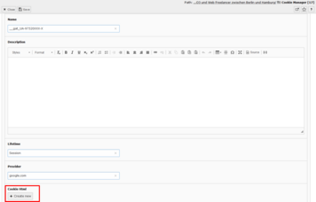 INFO:Du kannst natürlich auch cookies anlegen, welche nur eine Beschreibung haben damit diese in der Infotabelle aufgelistet werden. Das ist nützlich wenn über ein Script mehrere Cookies erzeugt werden(z. B. bei google analytics).